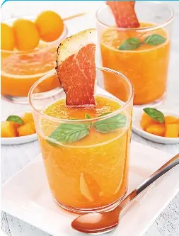 In blender, puree cantaloupe, pepper, tomatoes, carrot juice, onion, olive oil, vinegar, Tabasco and 1⁄4 tsp. salt. Transfer to glasses; add bacon. Garnish with basil.